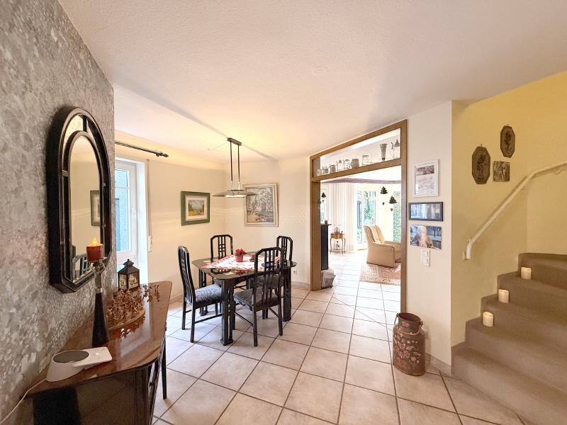 Sehr helle und freundliche Doppelhaushälfte mit einem ungewöhnlichen Schnitt und viel Platz für Ihre Familie zu verkaufen. Auf diesen ca. 125 m² Wohnfläche, die sich auf 2 Etagen verteilen, können Sie so richtig aufleben. Das Herzstück des Hauses bildet das grosse und offene Wohn-/ Esszimmer mit ca. 42 m². Die Räume haben eine Süd-Ost-Ausrichtung mit Morgensonne und lassen durch die bodentiefen Fenster viel Licht hinein. Von hier aus haben sie auch den Zugang auf die Terrasse und den angrenzenden Garten mit Gartenhaus und viel Quality-Time. Hier können Sie es sich so richtig gut gehen lassen. Für heisse Sommertage und Abende wurde die gesamte Hausbreite mit einer Markise versehen. Das Tageslicht-Gäste-WC ist hellgrau gefliest. Die Küche ist eine klassische Arbeitsküche mit angrenzendem Vorratsraum. Über eine offene Treppe gelangen Sie in das Obergeschoss. Hier befinden sich 3 Schlafzimmer. Das Fenster im Elternschlafzimmer muss erneuert werden. Ein Angebot für den Austausch aller Fenster liegt bereits vor. Im Tageslicht-Badezimmer, welches mit einer Badewanne und einer Dusche ausgestattet ist, befindet sich ebenfalls ein bodentiefes Fenster und die Deckenbemalung lädt zum Träumen und Entspannen ein. Das gesamte EG ist durchgehend gefliest und im OG liegt durchgehend Teppichboden. Im Keller befindet sich ebenfalls ein Duschbad, ein beheizter Hobbyraum mit Fenster und natürlich ein Raum zum Handwerken und Waschen. Ein weiterer Raum, der für Vorräte genutzt wird, ist ebenfalls vorhanden. Angrenzend am Haus befindet sich eine Garage und die Möglichkeit eines weiteren Aussenstellplatzes vor der Garage.